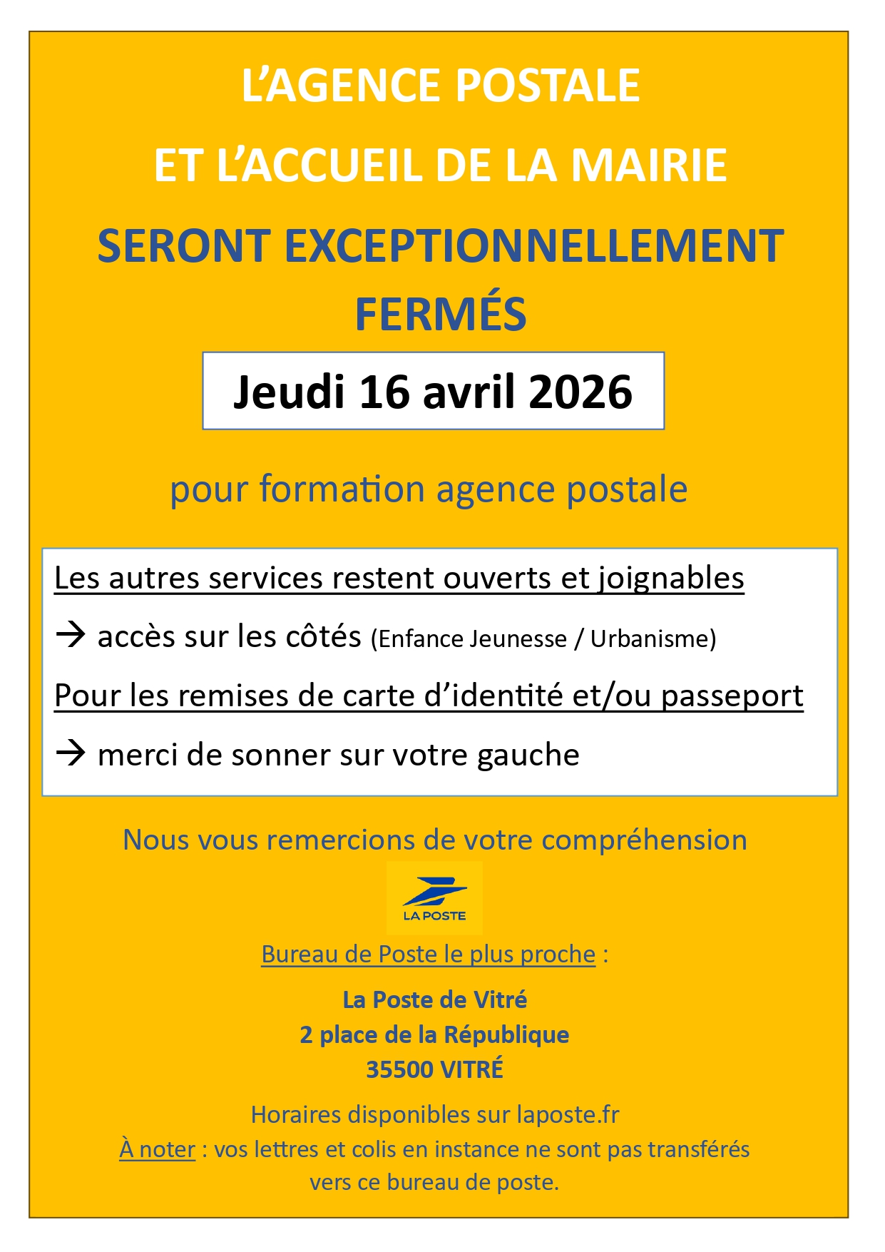 Fermeture exceptionnelle de l’agence postale – Jeudi 16 avril 2026